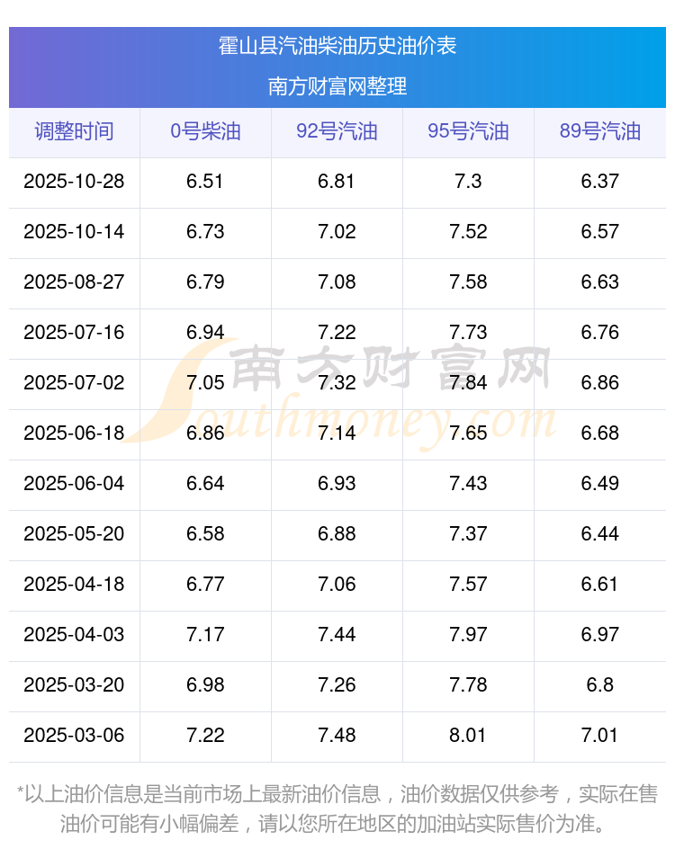 霍山縣汽油、柴油11月6日每升的價格為10月28日調(diào)整后的價格:92號汽油6.81元;95號汽油7.3元;89號汽油6.37元;0號柴油6.51元。