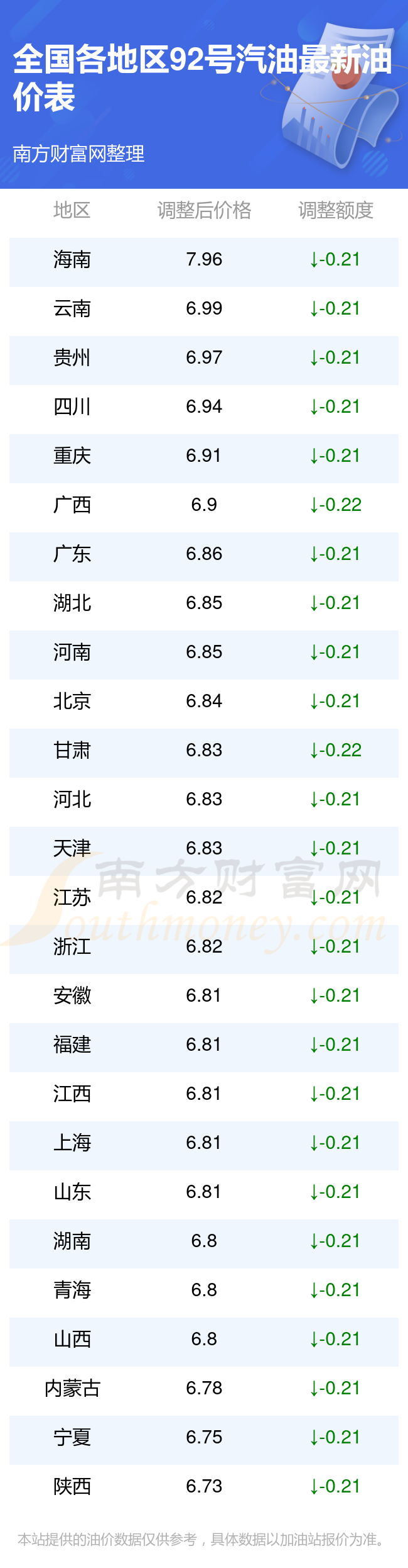 以上數(shù)據(jù)僅供參考,請(qǐng)以您所在地區(qū)的加油站實(shí)際售價(jià)為準(zhǔn)。南方財(cái)富網(wǎng)發(fā)布此信息的目的在于傳播更多信息,對(duì)使用該油價(jià)信息所導(dǎo)致的結(jié)果概不承擔(dān)責(zé)任。