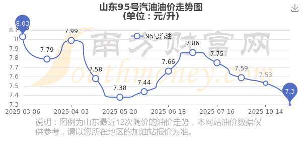 11月7日,山東95號汽油的價格是7.3元每升,本次的調(diào)整時間為10月28日,對比上次的調(diào)整跌了0.23元,跌3.054%,下次調(diào)整時間為11月10日24時,還有3.85天。