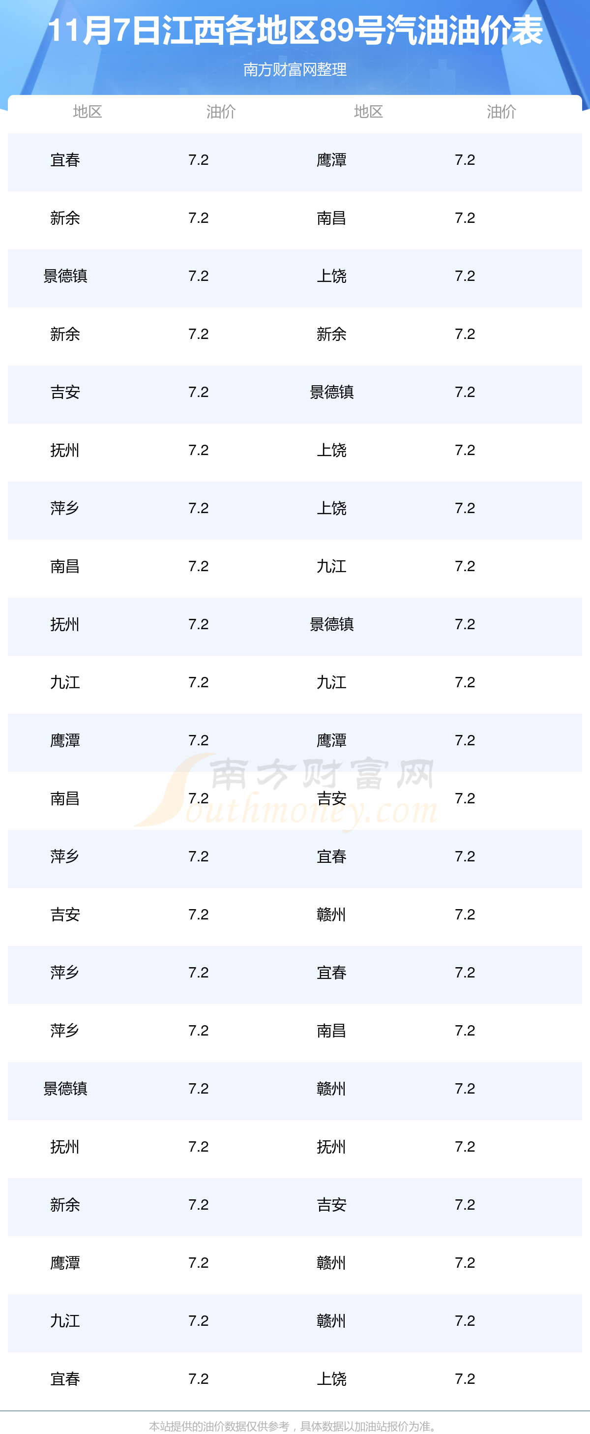 11月7日,江西89號汽油的價格是6.33元每升,本次的調(diào)整時間為10月28日,對比上次的調(diào)整下跌了0.19元,下跌2.914%,下次調(diào)整時間為11月10日24時,還有3.83天。