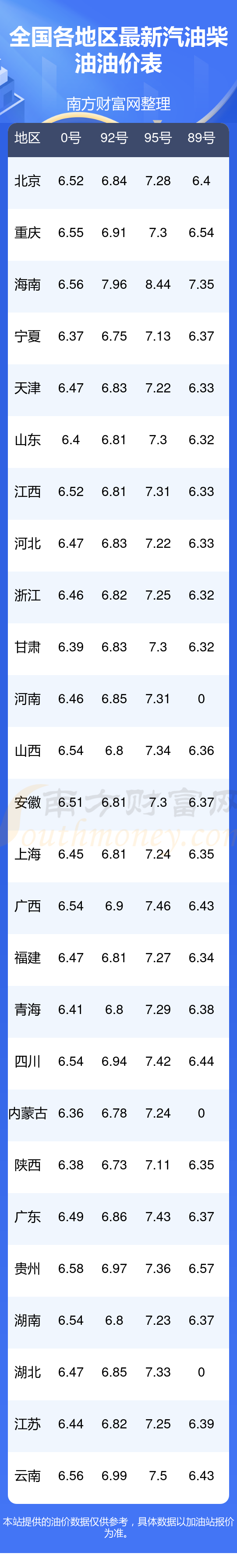以上數(shù)據(jù)僅供參考,請(qǐng)以您所在地區(qū)的加油站實(shí)際售價(jià)為準(zhǔn)。南方財(cái)富網(wǎng)發(fā)布此信息的目的在于傳播更多信息,對(duì)使用該油價(jià)信息所導(dǎo)致的結(jié)果概不承擔(dān)責(zé)任。
