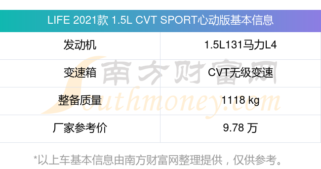 LIFE 2021款 1.5L CVT SPORT心動版動力上配備的是一臺1.5L131馬力L4自然吸氣發(fā)動機,匹配的是CVT無級變速自動檔變速箱,燃料形式為汽油,常規(guī)整備質(zhì)量1118kg,廠家參考價9.78萬元。