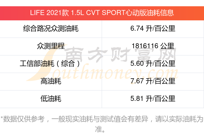 根據(jù)車主實測數(shù)據(jù),該車型低油耗為5.81升/百公里,高油耗為7.67升/百公里,綜合路況眾測油耗為6.74升/百公里,工信部綜合油耗為5.60升/百公里。