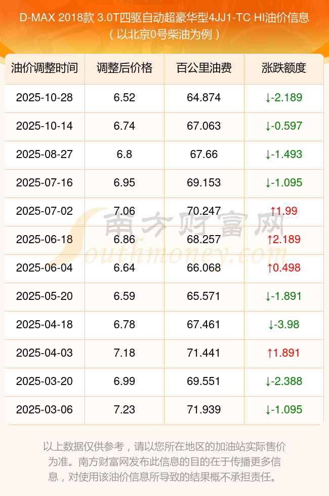 按照10月28日0號柴油最新調(diào)整價格6.52元/升來計(jì)算(以北京為例),該車型百公里平均油費(fèi)為64.874元,按照上一輪10月14日調(diào)整價格6.74元/升來計(jì)算,百公里平均油費(fèi)為67.063元,對比上一輪少花2.189元,下一輪油價調(diào)整時間為11月10日24時。