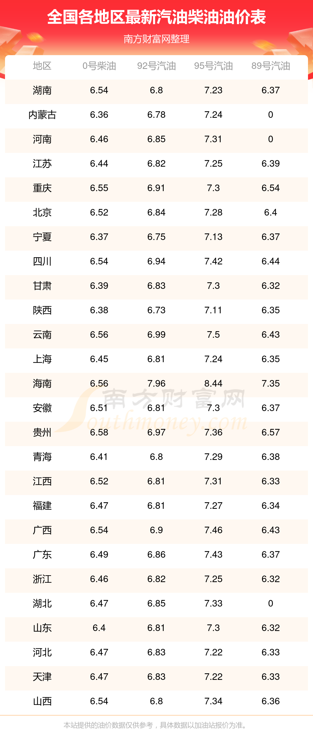 油價(jià)數(shù)據(jù)僅供參考,請(qǐng)以您所在地區(qū)的加油站報(bào)價(jià)為準(zhǔn)。南方財(cái)富網(wǎng)發(fā)布此信息的目的在于傳播更多信息,對(duì)使用該油價(jià)信息所導(dǎo)致的結(jié)果概不承擔(dān)任何責(zé)任。