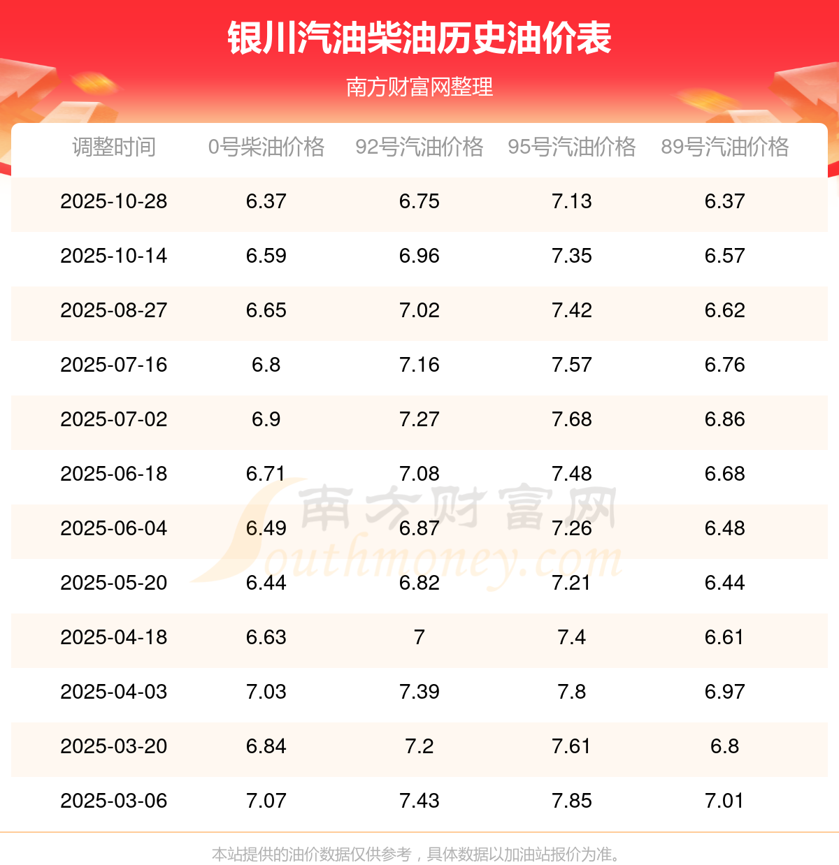 銀川汽油、柴油11月7日每升最新價格:92號汽油為6.75元;95號汽油為7.13元;89號汽油為6.37元;0號柴油為6.37元,本輪油價調(diào)整時間為10月28日。