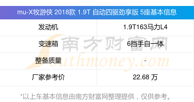 mu-X牧游俠 2018款 1.9T 自動(dòng)四驅(qū)勁享版 5座動(dòng)力上搭載的是一臺(tái)1.9T163馬力L4渦輪增壓發(fā)動(dòng)機(jī),匹配6擋手自一體自動(dòng)檔變速箱,燃料形式為柴油,廠家參考價(jià)22.68萬(wàn)元。