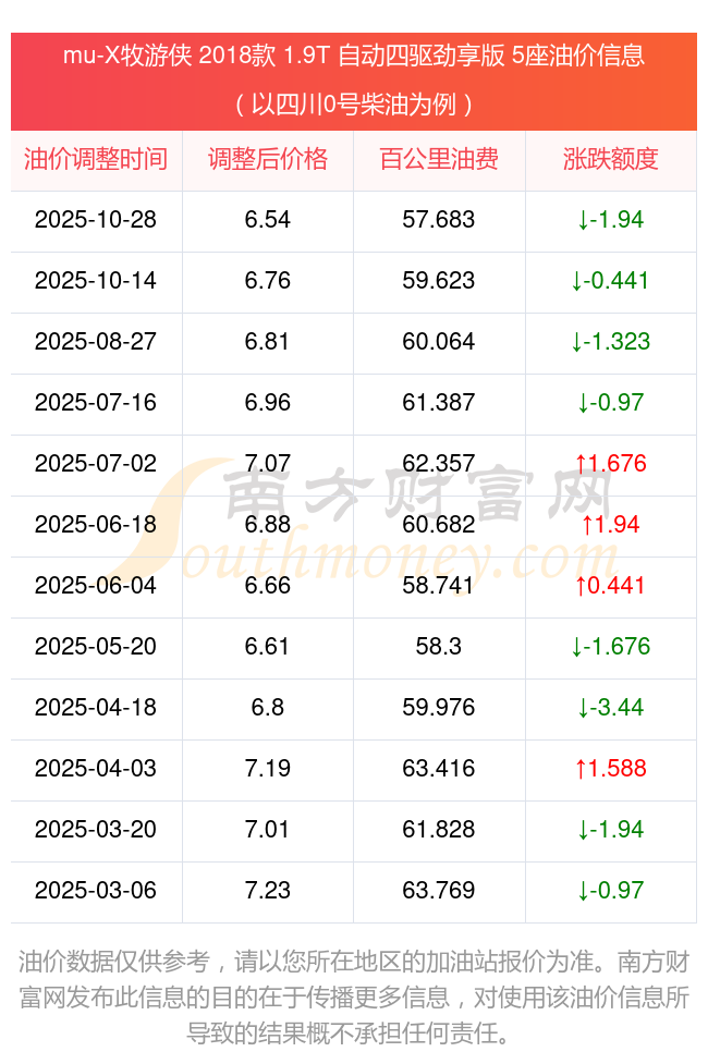 依照10月28日0號(hào)柴油最新調(diào)整價(jià)格6.54元/升來(lái)計(jì)算(以四川為例),該車(chē)型百公里的平均油費(fèi)是57.683元,依照上一輪10月14日調(diào)整價(jià)格6.76元/升來(lái)計(jì)算,百公里的平均油費(fèi)是59.623元,對(duì)比上一輪少花1.94元,下一輪的油價(jià)調(diào)整時(shí)間11月10日24時(shí)。