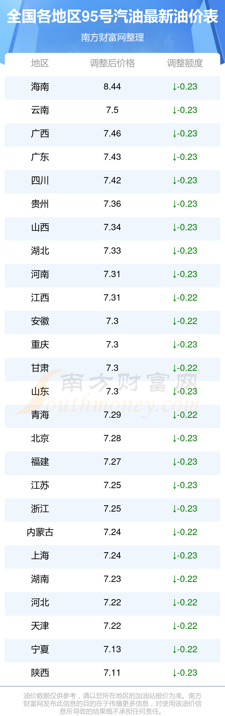 全國(guó)各地區(qū)95號(hào)汽油油價(jià)一覽表