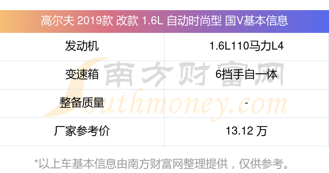 在動(dòng)力方面,高爾夫 2019款 改款 1.6L 自動(dòng)時(shí)尚型 國V搭載的是一臺(tái)1.6L110馬力L4自然吸氣發(fā)動(dòng)機(jī),匹配6擋手自一體自動(dòng)檔變速箱,燃料形式為汽油,廠家參考價(jià)13.12萬元。