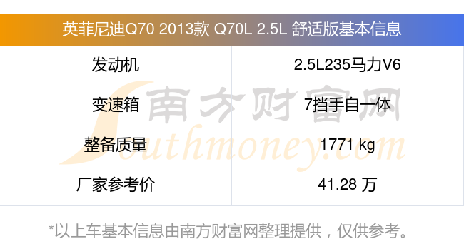 英菲尼迪Q70 2013款 Q70L 2.5L 舒適版動(dòng)力方面,搭載的是一臺(tái)2.5L235馬力V6自然吸氣發(fā)動(dòng)機(jī),匹配7擋手自一體自動(dòng)檔變速箱,燃料形式為汽油,常規(guī)整備質(zhì)量1771kg,廠家參考價(jià)41.28萬(wàn)元。
