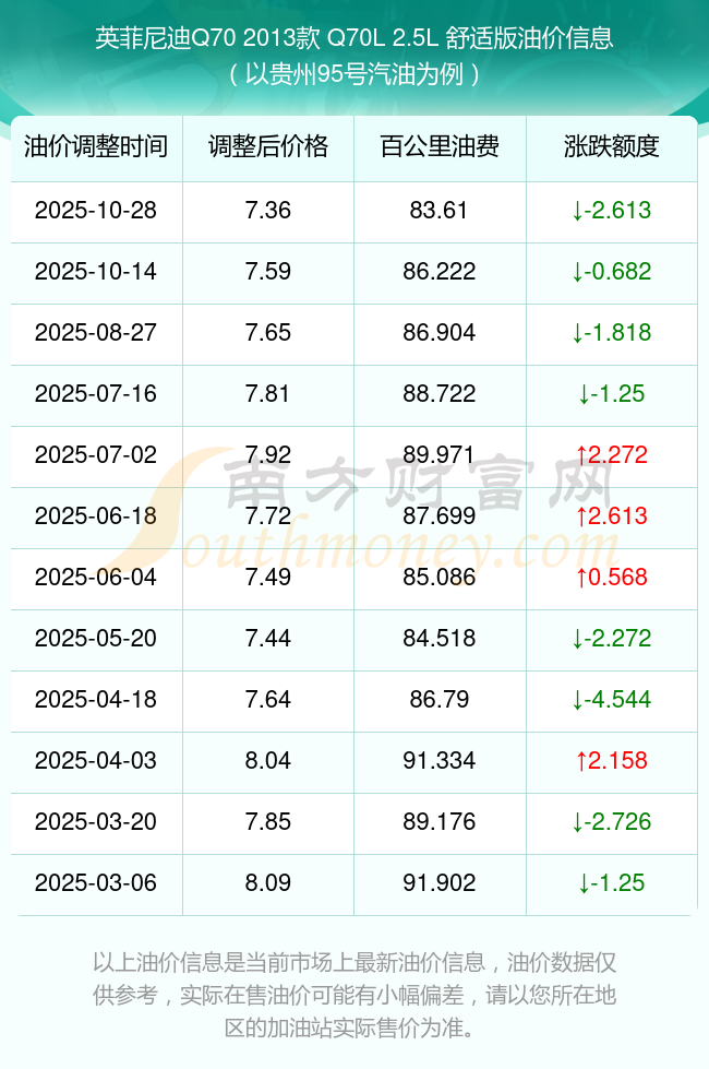 依照10月28日95號(hào)汽油最新調(diào)整價(jià)格7.36元/升來(lái)計(jì)算(以貴州為例),該車型百公里的平均油費(fèi)是83.61元,依照上一輪10月14日調(diào)整價(jià)格7.59元/升來(lái)計(jì)算,百公里的平均油費(fèi)是86.222元,對(duì)比上一輪少花2.613元,下一輪的油價(jià)調(diào)整時(shí)間11月10日24時(shí)。