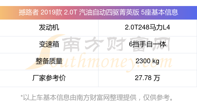 撼路者 2019款 2.0T 汽油自動四驅菁英版 5座動力上配備的是一臺2.0T248馬力L4渦輪增壓發(fā)動機,匹配的是6擋手自一體自動檔變速箱,燃料形式為汽油,常規(guī)整備質量2300kg,廠家參考價27.78萬元。