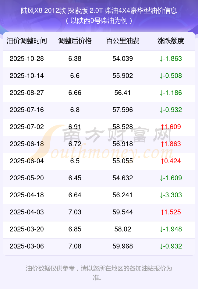 依照10月28日0號(hào)柴油最新調(diào)整價(jià)格6.38元/升來計(jì)算(以陜西為例),該車型百公里的平均油費(fèi)是54.039元,依照上一輪10月14日調(diào)整價(jià)格6.6元/升來計(jì)算,百公里的平均油費(fèi)是55.902元,對(duì)比上一輪少花1.863元,下一輪的油價(jià)調(diào)整時(shí)間11月10日24時(shí)。