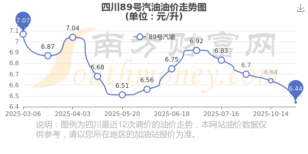 11月7日,四川89號汽油的價格是6.44元每升,本次的調整時間為10月28日,對比上次的調整下降了0.2元,下降3.012%,11月10日24時為下一輪油價調整時間,還有3.61天。