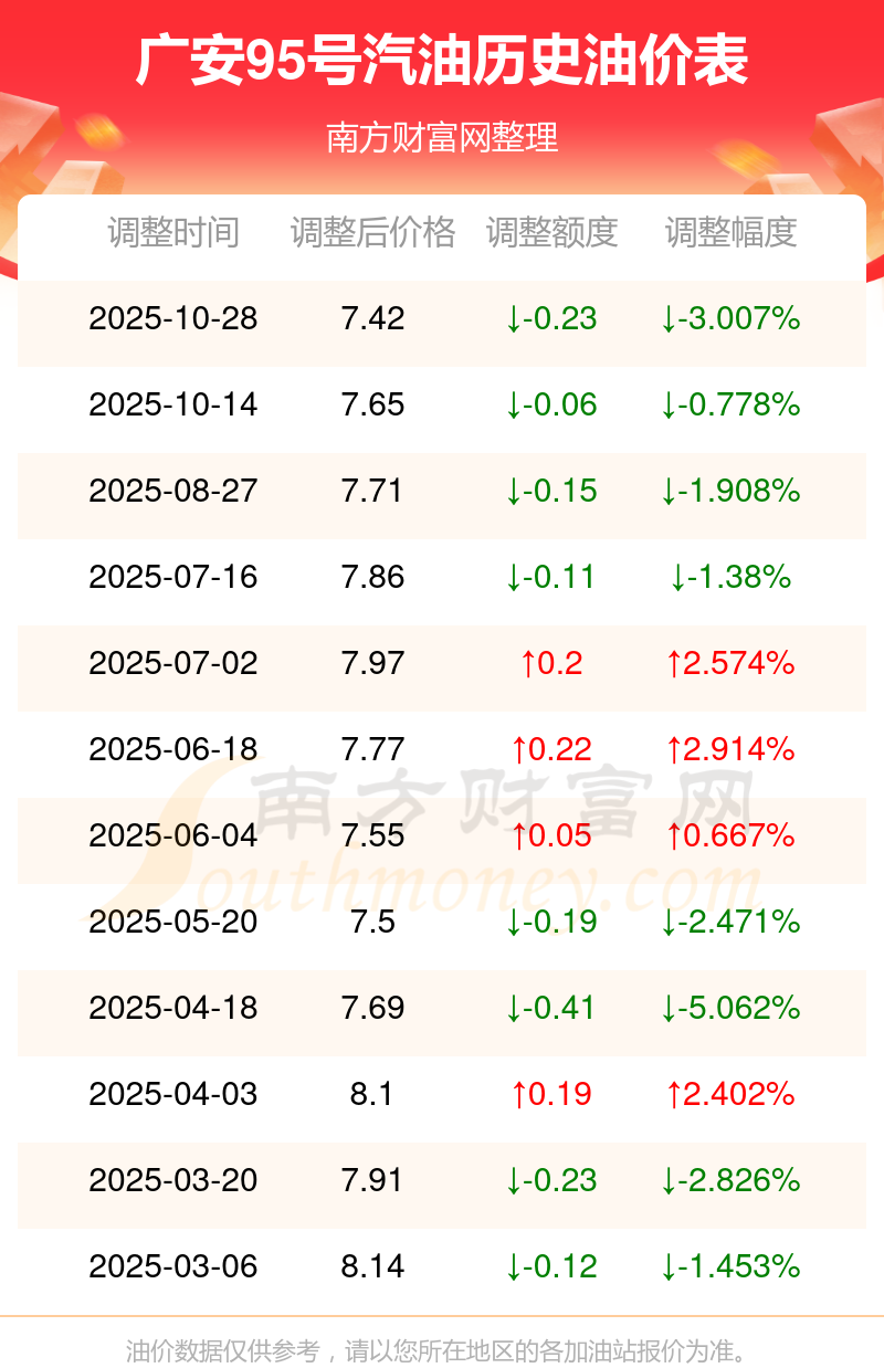 2025年95號(hào)汽油價(jià)格調(diào)整一覽表