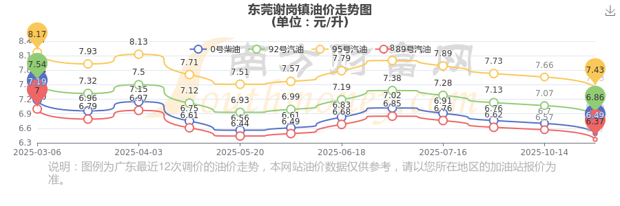 東莞謝崗鎮(zhèn)11月7日0號柴油歷史油價調整走勢圖