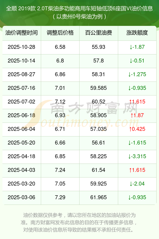 按10月28日0號(hào)柴油最新調(diào)整價(jià)格6.58元每升來(lái)計(jì)算(以貴州為例),該車型百公里平均油費(fèi)為55.93元,按上一輪10月14日調(diào)整價(jià)格6.8元每升來(lái)計(jì)算,百公里平均油費(fèi)為57.8元,對(duì)比上一輪少花1.87元,下一輪油價(jià)調(diào)整時(shí)間為11月10日24時(shí)。