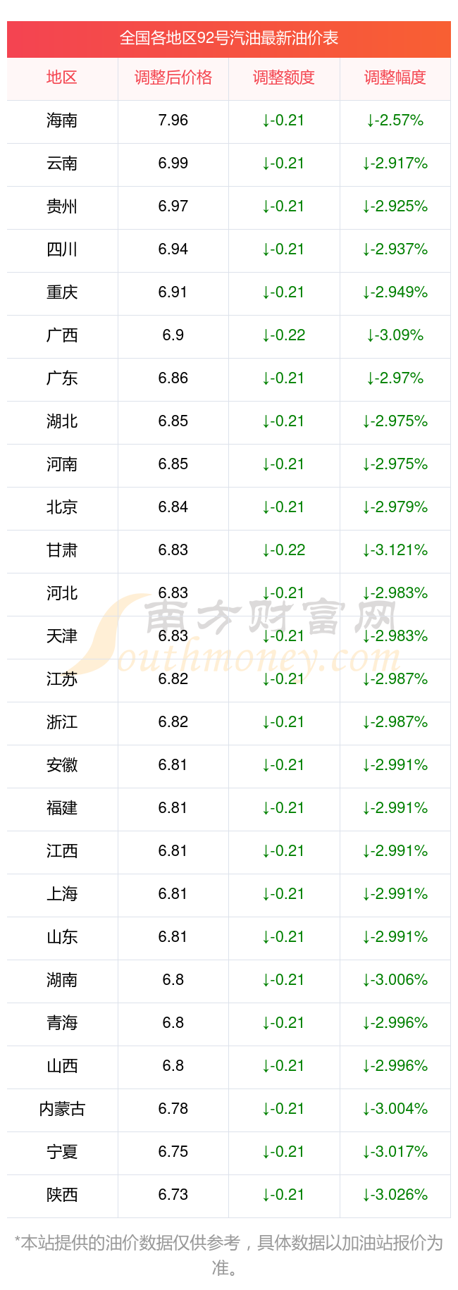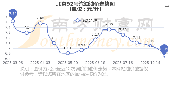 11月7日,北京92號汽油的價格是6.84元每升,本次的調整時間為10月28日,對比上次的調整跌了0.21元,跌2.979%,下次調整時間為11月10日24時,還有3.59天。