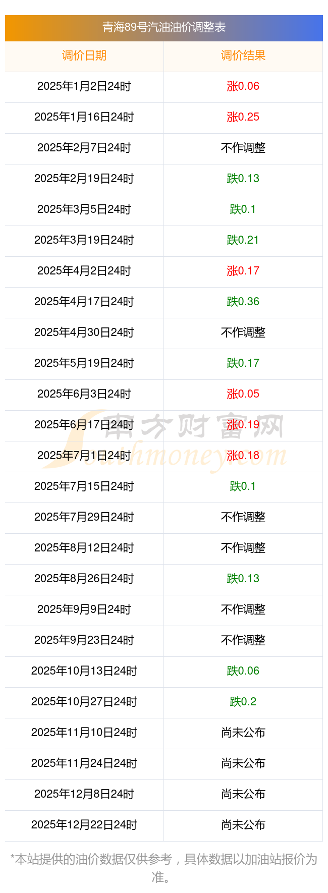 油價數(shù)據(jù)僅供參考,請以您所在地區(qū)的加油站報價為準(zhǔn)。南方財(cái)富網(wǎng)發(fā)布此信息的目的在于傳播更多信息,對使用該油價信息所導(dǎo)致的結(jié)果概不承擔(dān)任何責(zé)任。