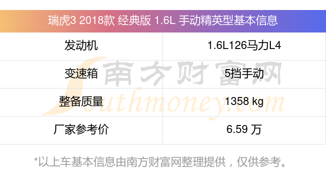 在動力上,瑞虎3 2018款 經典版 1.6L 手動精英型配備的是一臺1.6L126馬力L4自然吸氣發(fā)動機,匹配的是5擋手動擋變速箱,燃料形式為汽油,常規(guī)整備質量1358kg,廠家參考價6.59萬元。