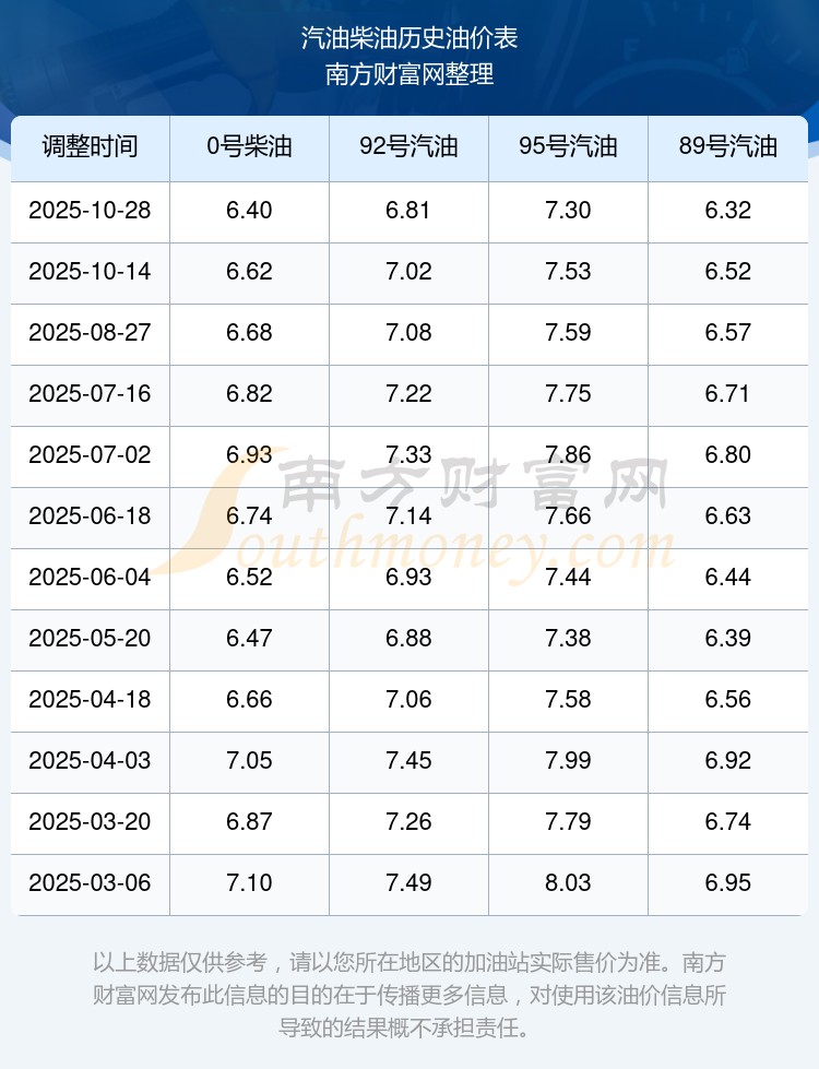 2025年95號(hào)汽油價(jià)格一覽表