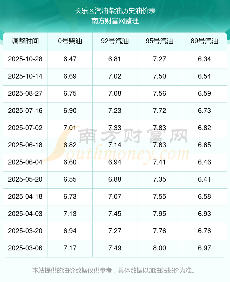 油價調(diào)整最新消息:下一輪油價調(diào)整時間11月10日24時。長樂區(qū)汽油、柴油11月7日的價格是多少錢一升?詳情為:92號汽油為6.81元,減了0.21元;95號汽油為7.27元,減了0.23元;89號汽油為6.34元,減了0.2元;0號柴油為6.47元,減了0.22元,本次油價的調(diào)整時間為10月28日。