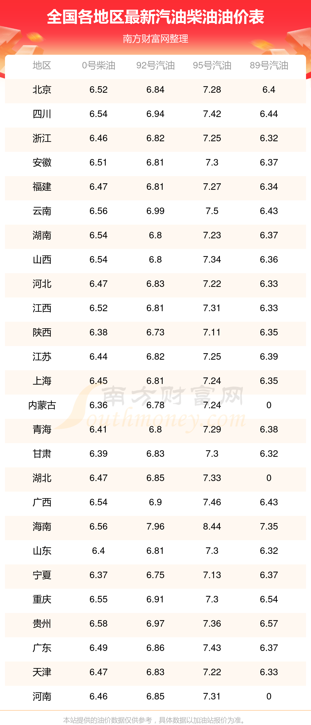 本輪油價的調整時間為10月28日,調整后全國92號汽油平均價格為7元每升,其中,最低為陜西的6.73元/升,最高為海南的7.96元/升。全國95號汽油平均價格為7元每升,其中,最低為陜西的7.11元/升,最高為海南的8.44元/升。全國0號柴油平均價格為:6元每升,其中,最低為內蒙古的6.36元/升,最高為貴州的6.58元/升。全國89號汽油平均價格為6元每升,其中,最低為浙江的6.32元/升,最高為海南的7.35元/升。,下一輪油價調整時間11月10日24時,距離現(xiàn)在還有3.57天。
