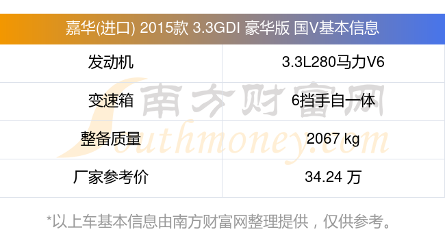 嘉華(進(jìn)口) 2015款 3.3GDI 豪華版 國V搭載了一臺3.3L280馬力V6自然吸氣發(fā)動機(jī),采用6擋手自一體自動檔變速箱,常規(guī)整備質(zhì)量2067kg,廠家參考價(jià)34.24萬元。