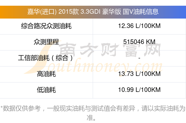 根據(jù)車主實(shí)測數(shù)據(jù),該車型低油耗為10.99L/100km,高油耗為13.73L/100km,綜合路況眾測油耗為12.36L/100km,工信部綜合油耗為-L/100km。