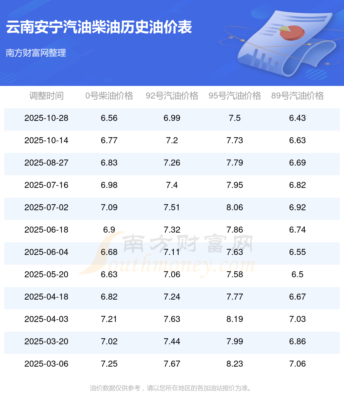 云南安寧汽油、柴油11月7日每升的價格為(油價調(diào)整時間是10月28日):92號汽油6.99元;95號汽油7.5元;89號汽油6.43元;0號柴油6.56元。