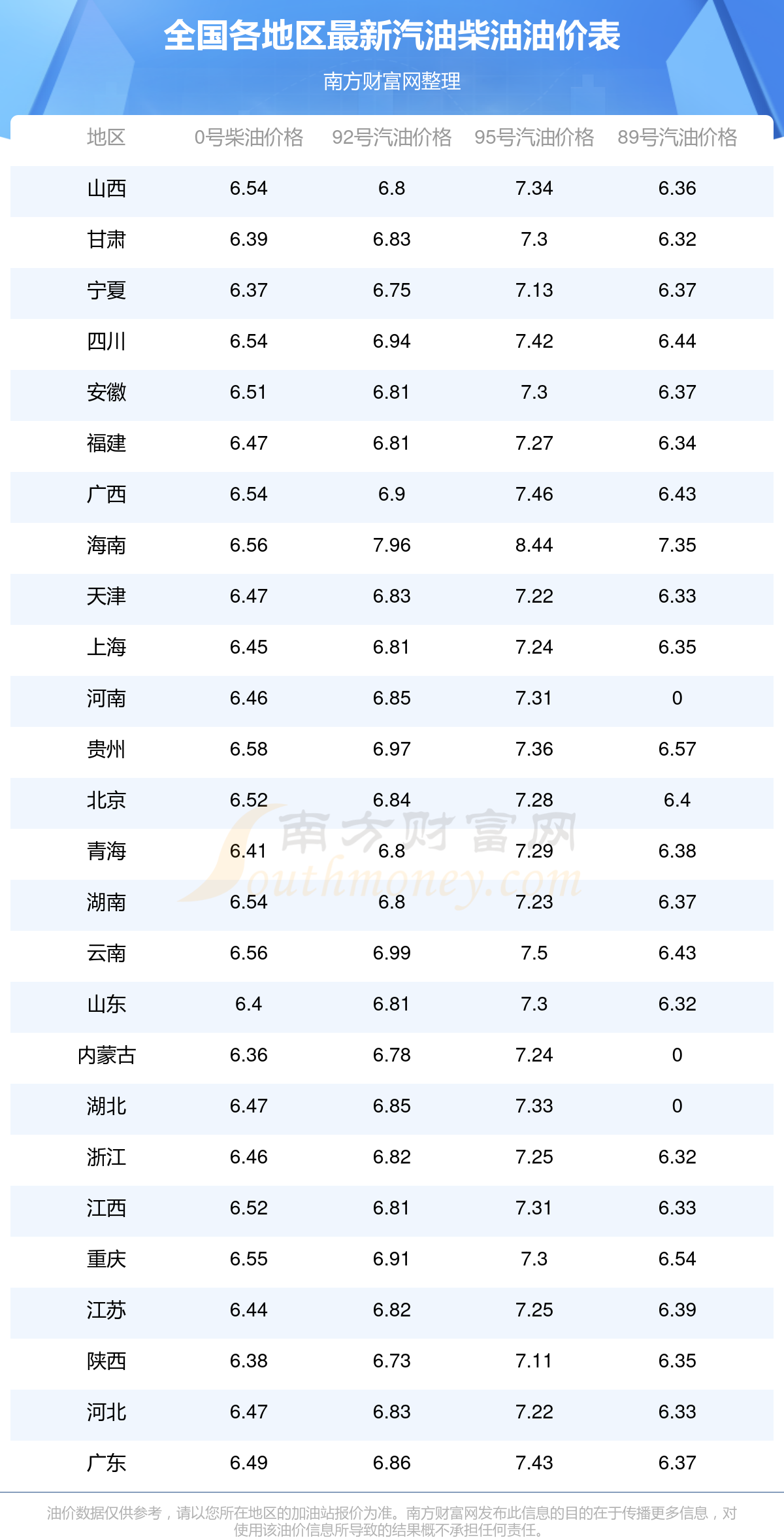 2025年11月7日全國(guó)各地汽油價(jià)格一覽表