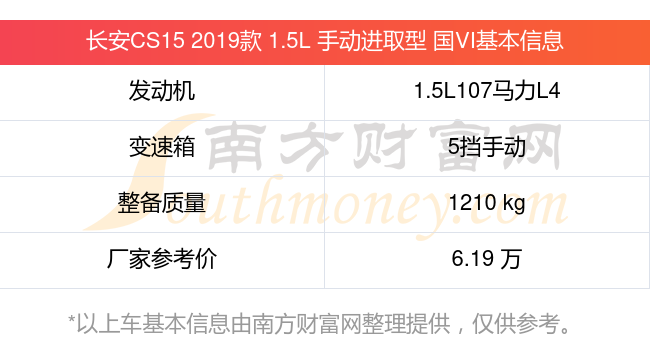 長安CS15 2019款 1.5L 手動(dòng)進(jìn)取型 國VI動(dòng)力上搭載的是一臺(tái)1.5L107馬力L4自然吸氣發(fā)動(dòng)機(jī),匹配5擋手動(dòng)擋變速箱,燃料形式為汽油,常規(guī)整備質(zhì)量1210kg,廠家參考價(jià)6.19萬元。