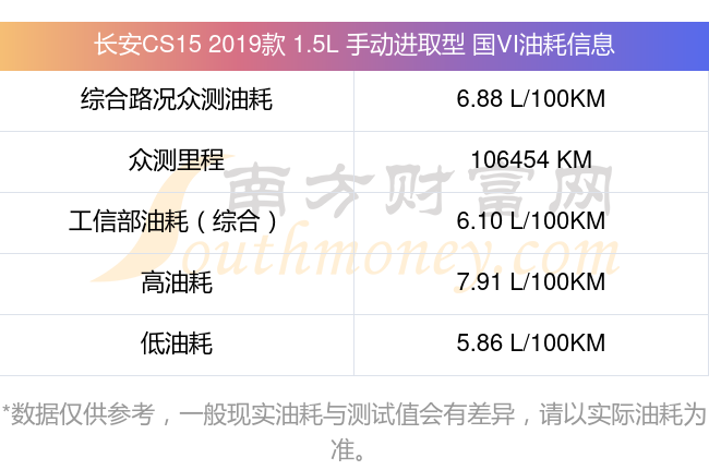 根據(jù)多位車主實(shí)測得出數(shù)據(jù),該車型低油耗為5.86升每百公里,高油耗為7.91升每百公里,綜合路況眾測油耗為6.88升每百公里,工信部綜合油耗為6.10升每百公里。