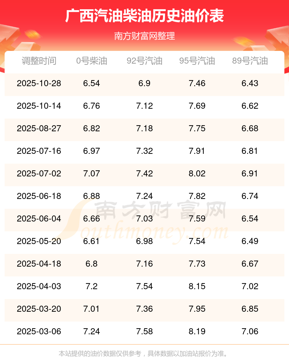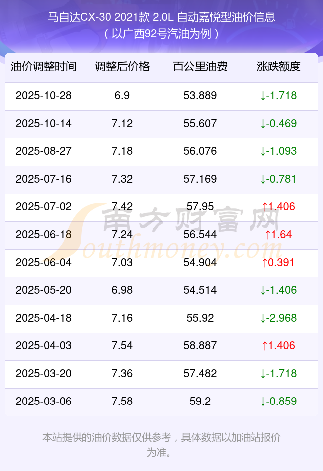 依照10月28日92號汽油最新調(diào)整價格6.9元/升來計算(以廣西為例),該車型百公里的平均油費是53.889元,依照上一輪10月14日調(diào)整價格7.12元/升來計算,百公里的平均油費是55.607元,對比上一輪少花1.718元,下一輪的油價調(diào)整時間11月10日24時。