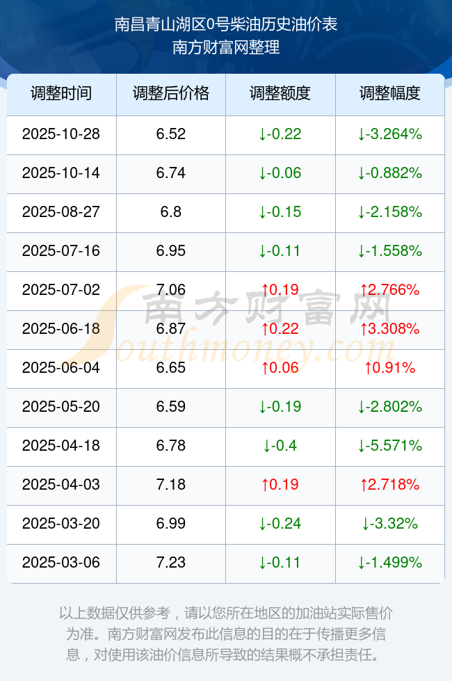 11月7日南昌青山湖區(qū)0號(hào)柴油歷史油價(jià)調(diào)整一覽表