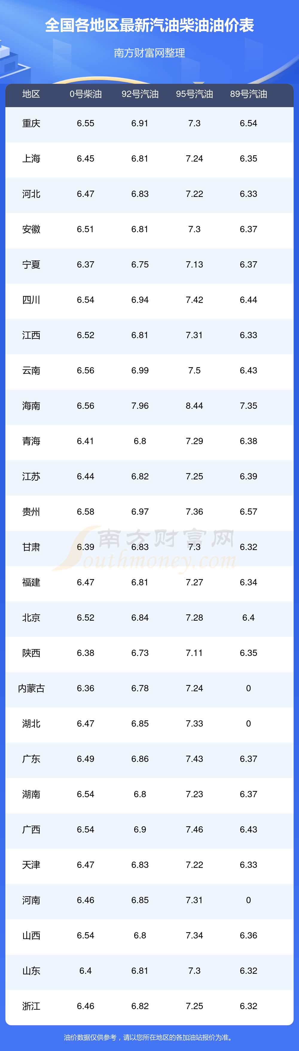 以上數(shù)據(jù)僅供參考,請(qǐng)以您所在地區(qū)的加油站實(shí)際售價(jià)為準(zhǔn)。南方財(cái)富網(wǎng)發(fā)布此信息的目的在于傳播更多信息,對(duì)使用該油價(jià)信息所導(dǎo)致的結(jié)果概不承擔(dān)責(zé)任。