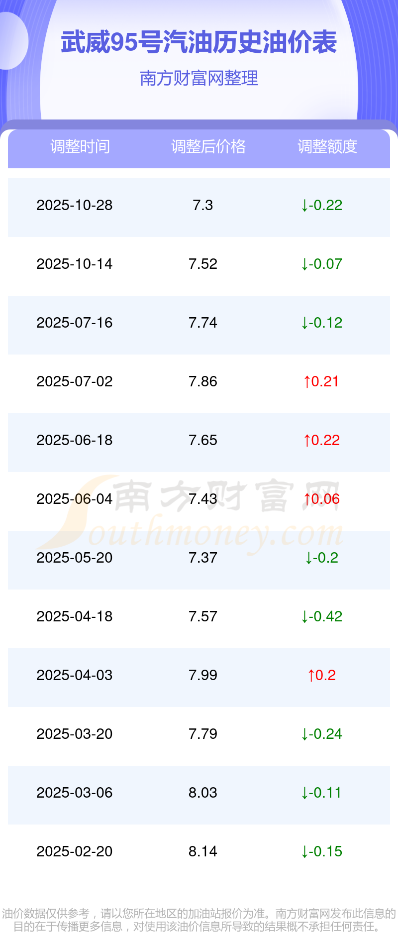 2025年95號(hào)汽油價(jià)格調(diào)整一覽表