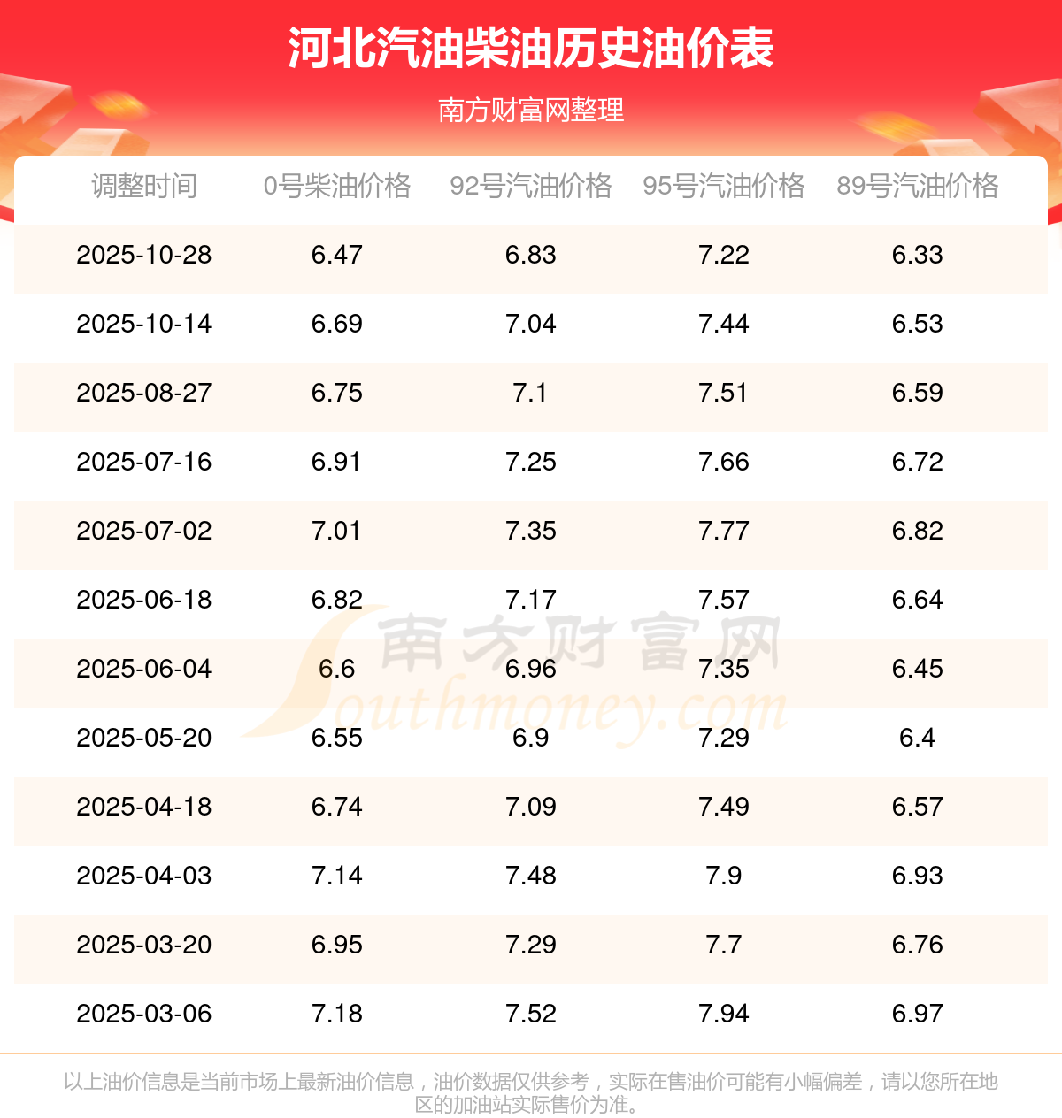 11月7日,河北0號(hào)柴油的價(jià)格是6.47元每升,本次的調(diào)整時(shí)間為10月28日,對(duì)比上次的調(diào)整減了0.22元,減3.288%,下次調(diào)整時(shí)間為11月10日24時(shí),還有3.53天。