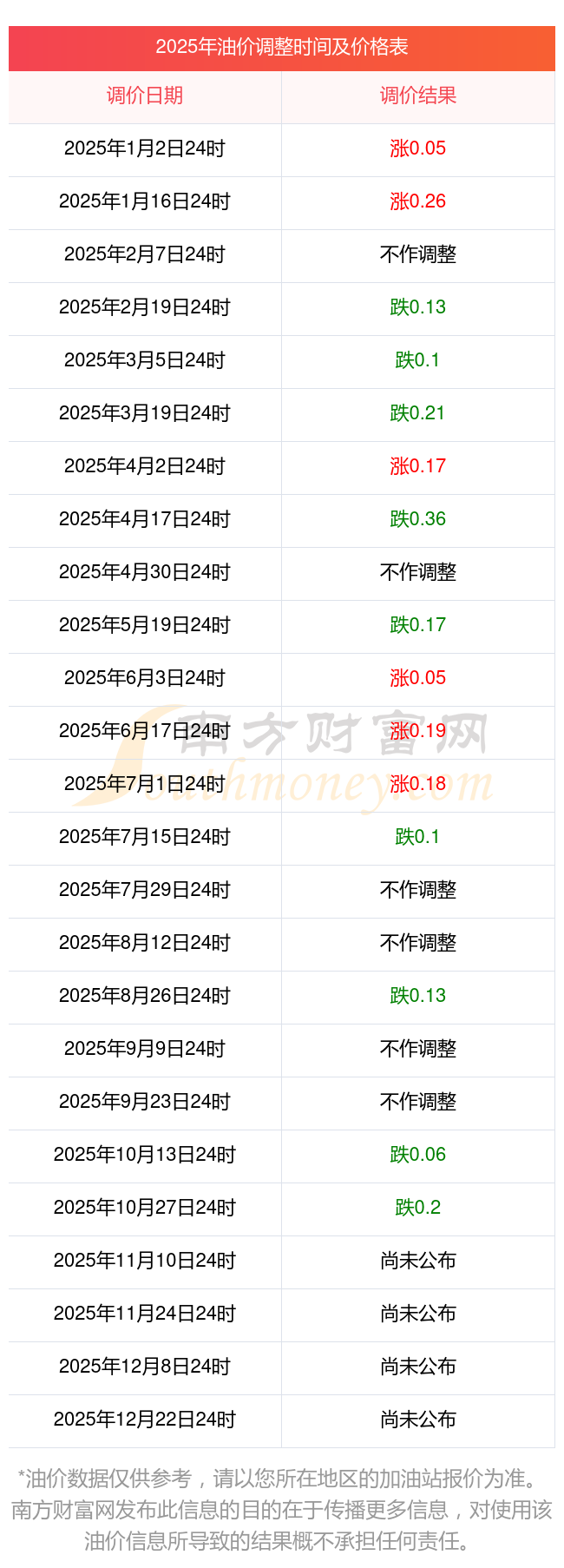 油價調(diào)整最新消息:平泉汽油、柴油11月7日每升最新價格為:95號汽油為7.22元,跌了0.22元;92號汽油為6.83元,跌了0.21元;89號汽油為6.33元,跌了0.2元;0號柴油為6.47元,跌了0.22元,調(diào)整時間為10月28日。平泉下一輪油價調(diào)整時間11月10日24時,距離現(xiàn)在還有3.53天。