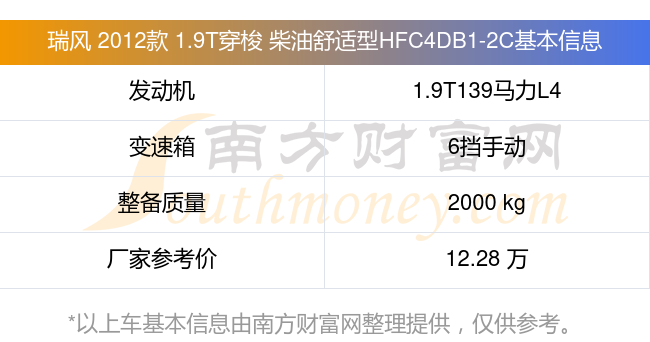 在動(dòng)力方面,瑞風(fēng) 2012款 1.9T穿梭 柴油舒適型HFC4DB1-2C搭載的是一臺(tái)1.9T139馬力L4渦輪增壓發(fā)動(dòng)機(jī),匹配6擋手動(dòng)擋變速箱,燃料形式為柴油,常規(guī)整備質(zhì)量2000kg,廠家參考價(jià)12.28萬元。
