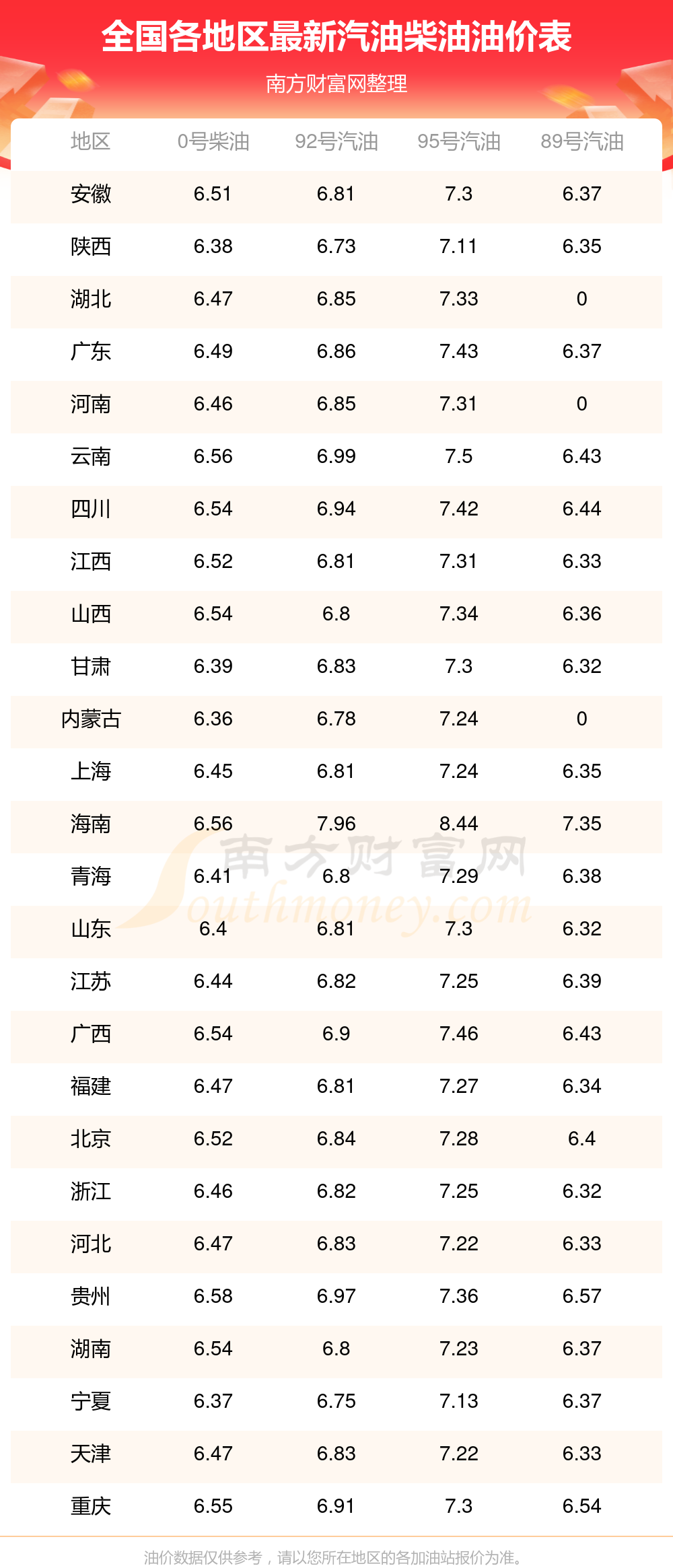 以上油價信息是當(dāng)前市場上最新油價信息,油價數(shù)據(jù)僅供參考,實際在售油價可能有小幅偏差,請以您所在地區(qū)的加油站實際售價為準(zhǔn)。