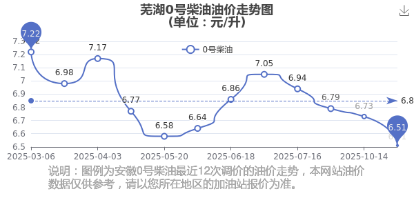 11月7日蕪湖0號(hào)柴油的最新價(jià)格(10月28日調(diào)整后的價(jià)格):6.51元/升,相對(duì)上次調(diào)整下跌了0.22元。