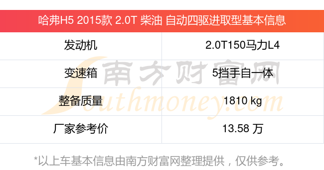 哈弗H5 2015款 2.0T 柴油 自動(dòng)四驅(qū)進(jìn)取型搭載了一臺(tái)2.0T150馬力L4渦輪增壓發(fā)動(dòng)機(jī),采用5擋手自一體自動(dòng)檔變速箱,常規(guī)整備質(zhì)量1810kg,廠家參考價(jià)13.58萬(wàn)元。