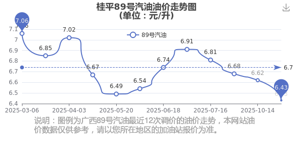 11月7日,桂平汽油、柴油價格多少錢一升?具體為:10月28日調(diào)整后,92號汽油為6.9元,下跌了0.22元,下跌幅達(dá)3.09%;95號汽油為7.46元,下跌了0.23元,下跌幅達(dá)2.99%;89號汽油為6.43元,下跌了0.19元,下跌幅達(dá)2.87%;0號柴油為6.54元,下跌了0.22元,下跌幅達(dá)3.25%。桂平下一輪油價調(diào)整時間11月10日24時,距離現(xiàn)在還有3.51天。