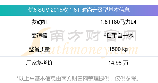 優(yōu)6 SUV 2015款 1.8T 時(shí)尚升級(jí)型動(dòng)力上配備的是一臺(tái)1.8T180馬力L4渦輪增壓發(fā)動(dòng)機(jī),匹配的是6擋手自一體自動(dòng)檔變速箱,燃料形式為汽油,常規(guī)整備質(zhì)量1500kg,廠家參考價(jià)14.98萬(wàn)元。