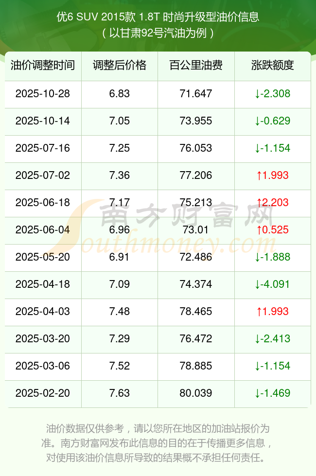 按照10月28日92號(hào)汽油最新調(diào)整價(jià)格6.83元/升來(lái)計(jì)算(以甘肅為例),該車型百公里平均油費(fèi)為71.647元,按照上一輪10月14日調(diào)整價(jià)格7.05元/升來(lái)計(jì)算,百公里平均油費(fèi)為73.955元,對(duì)比上一輪少花2.308元,下一輪油價(jià)調(diào)整時(shí)間為11月10日24時(shí)。