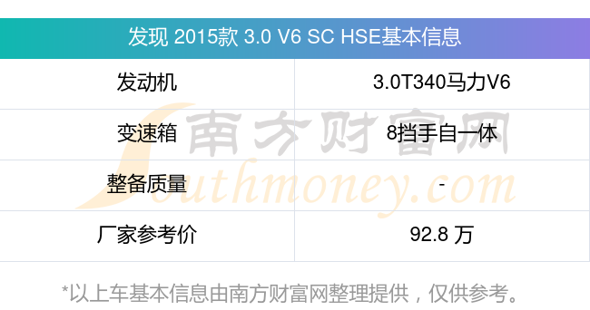 在動(dòng)力方面,發(fā)現(xiàn) 2015款 3.0 V6 SC HSE搭載的是一臺(tái)3.0T340馬力V6機(jī)械增壓發(fā)動(dòng)機(jī),匹配8擋手自一體自動(dòng)檔變速箱,燃料形式為汽油,廠家參考價(jià)92.8萬元。