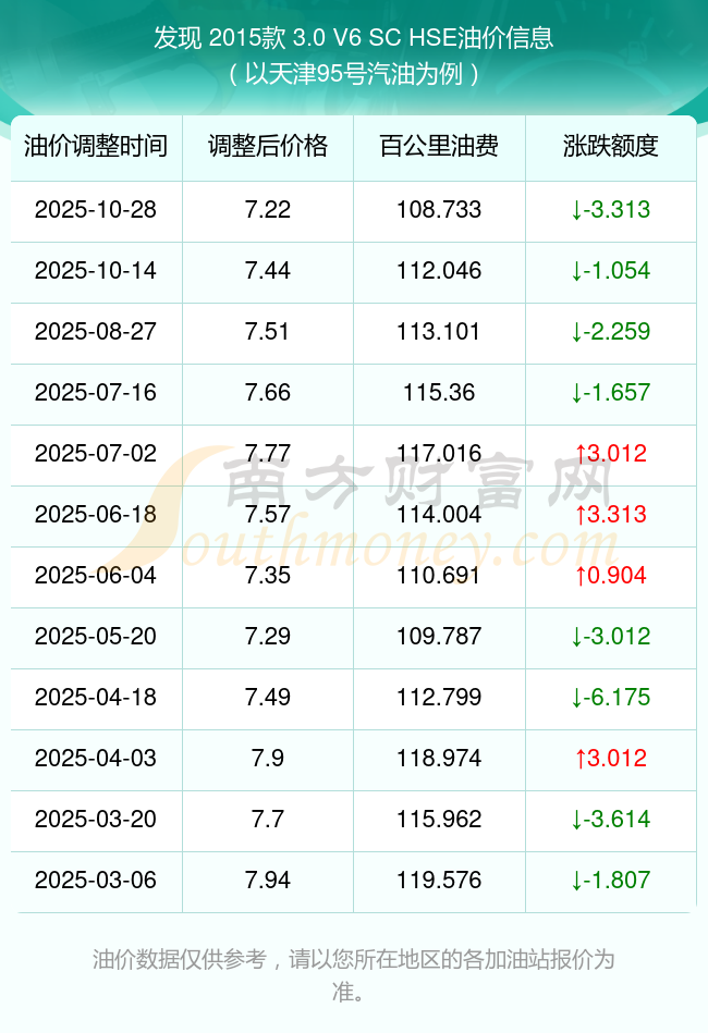 按10月28日95號(hào)汽油最新調(diào)整價(jià)格7.22元每升來計(jì)算(以天津?yàn)槔?,該車型百公里平均油費(fèi)為108.733元,按上一輪10月14日調(diào)整價(jià)格7.44元每升來計(jì)算,百公里平均油費(fèi)為112.046元,對(duì)比上一輪少花3.313元,下一輪油價(jià)調(diào)整時(shí)間為11月10日24時(shí)。