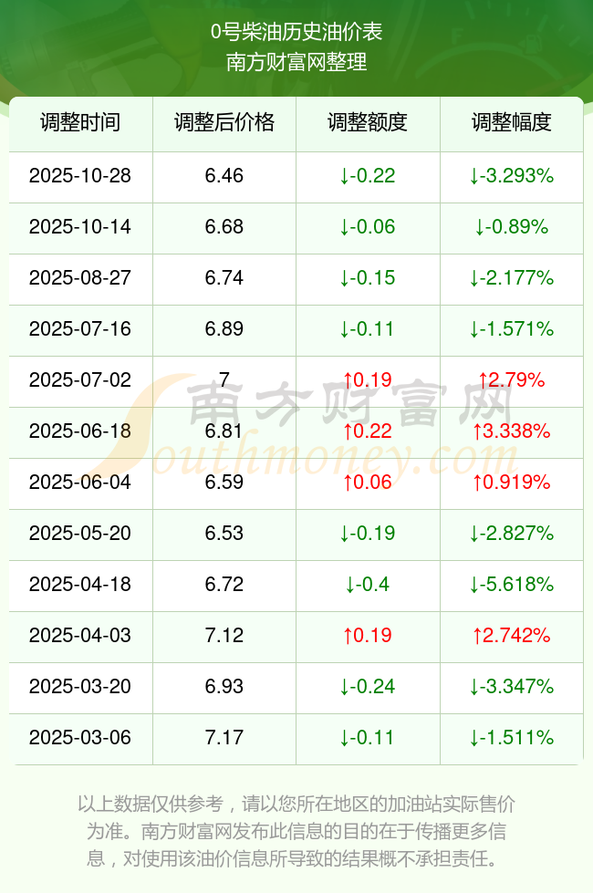 11月7日,汽油、柴油每升最新價格:本輪的油價調(diào)整時間是10月28日,92號汽油為6.85元,下調(diào)了0.21元,下調(diào)幅達(dá)2.98%;95號汽油為7.31元,下調(diào)了0.23元,下調(diào)幅達(dá)3.05%;0號柴油為6.46元,下調(diào)了0.22元,下調(diào)幅達(dá)3.29%。下一輪油價調(diào)整時間11月10日24時,距離現(xiàn)在還有3.51天。